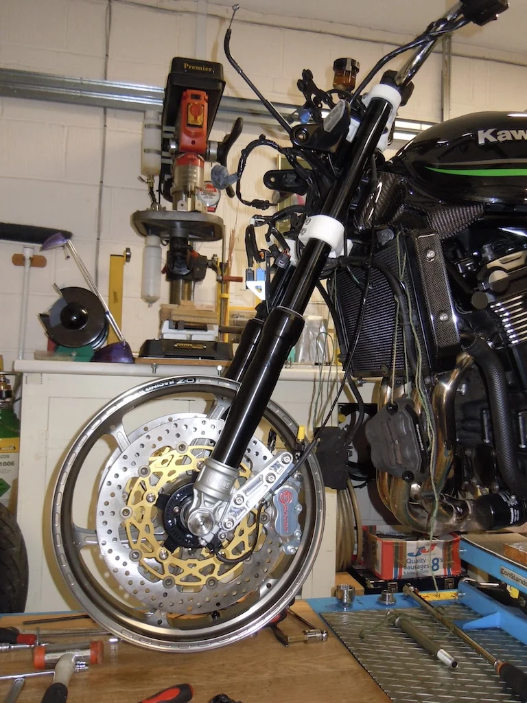 Quite possibly, I did spend some time trawling the World Wide Web, in particular the Japanese site WeBike, but I couldn't quite find exactly what I wanted & couldn't be certain of fork, brake disc size fitment bearing in mind translating from Japanese to English. I find WeBike's web site is not the easiest to navigate around to find what you are looking for although they do have various yoke kits available & caliper adaptor brackets & their parts that I have bought have always been top quality & their service is brilliant. However, they all appear to assume you are fitting standard size discs & USD forks, albeit the forks might be Ohlins. Also, there didn't seem to be a front axle to suit what I was planning.